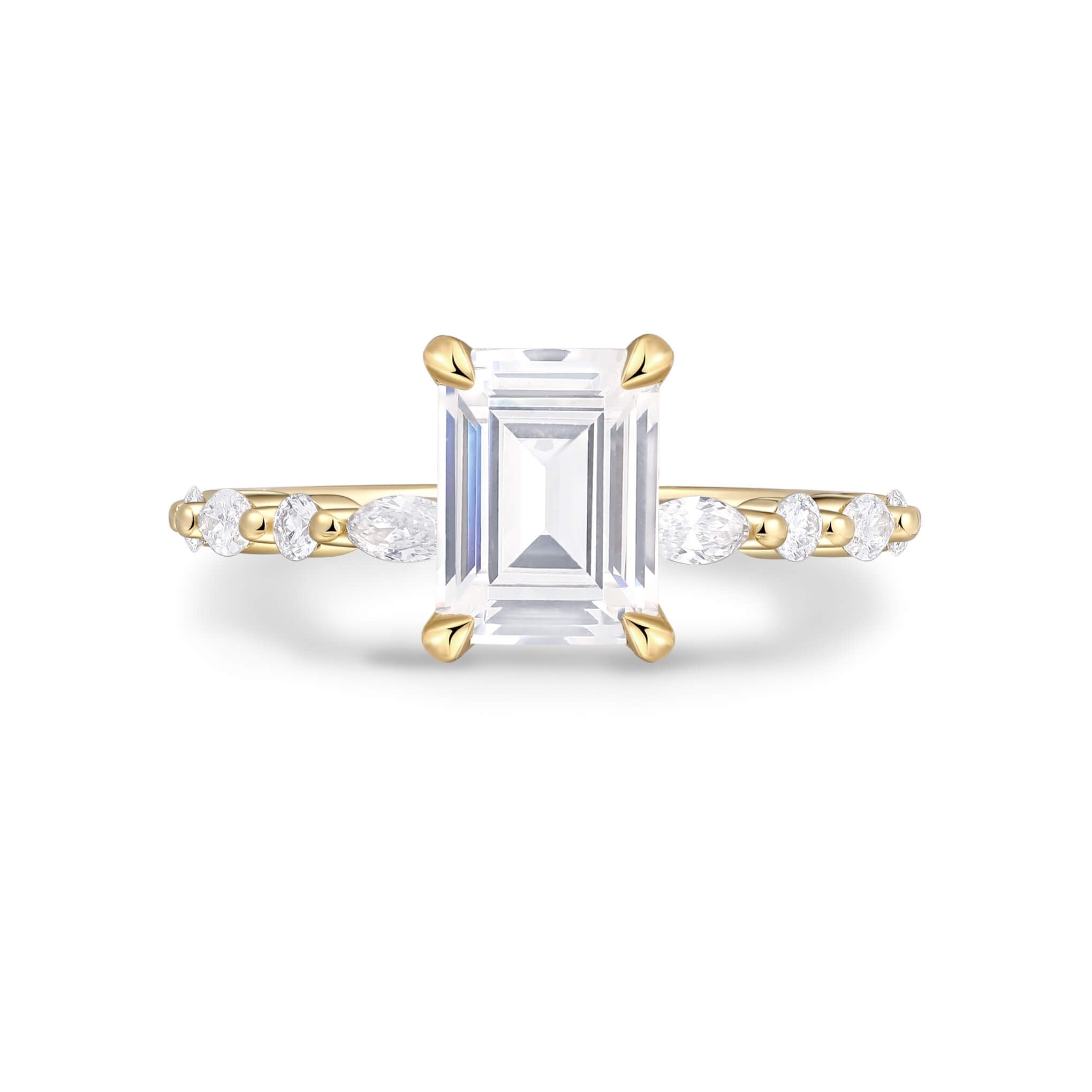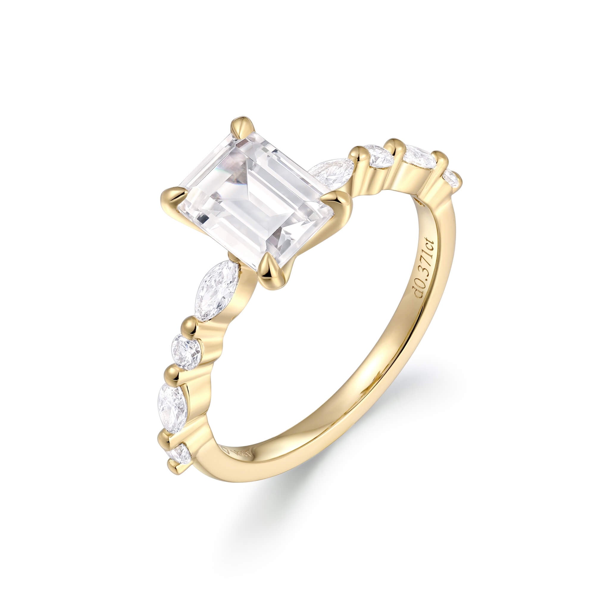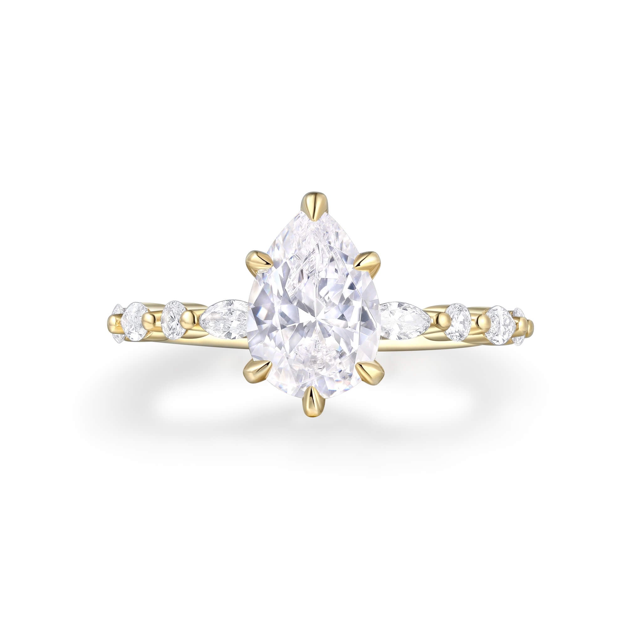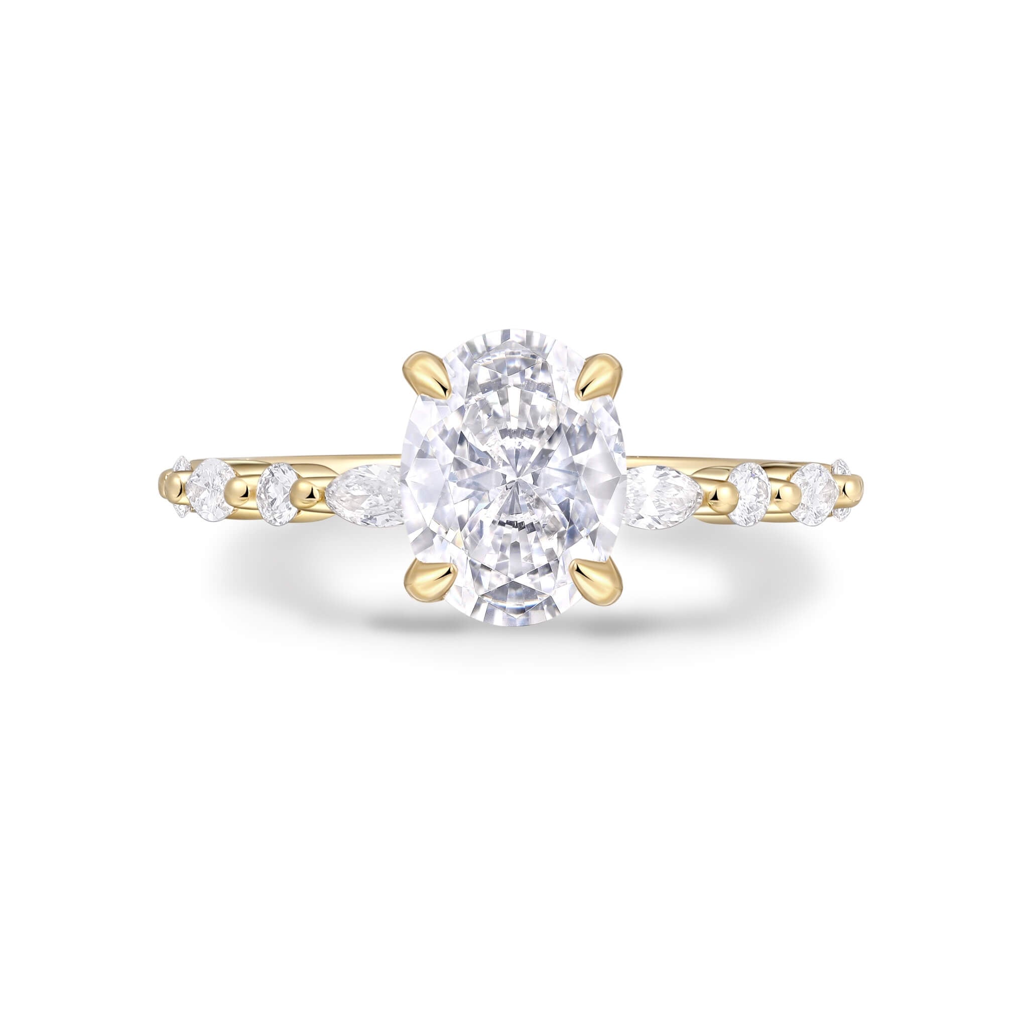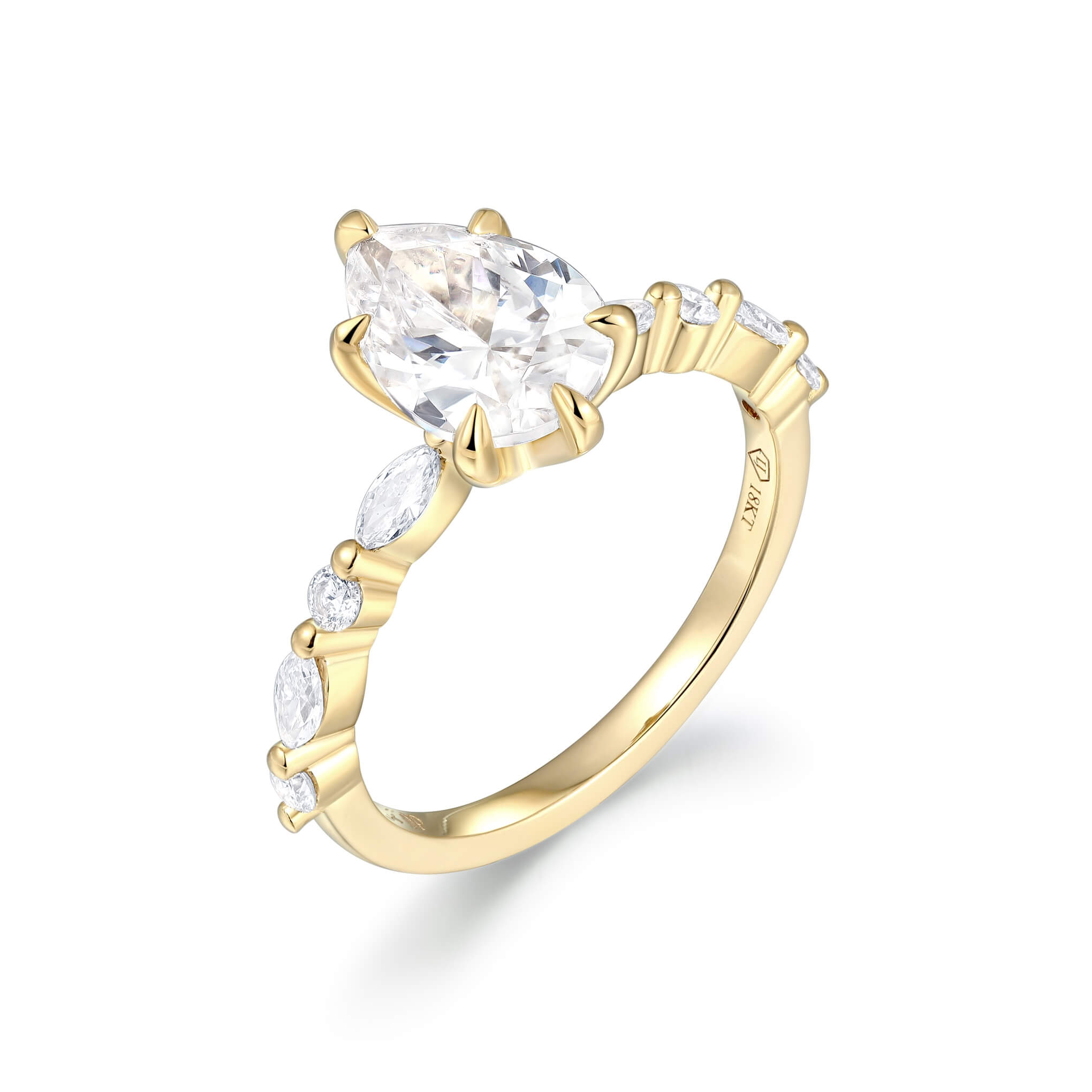 • Accent Stones: Marquise and round stones beautifully complement the center stone