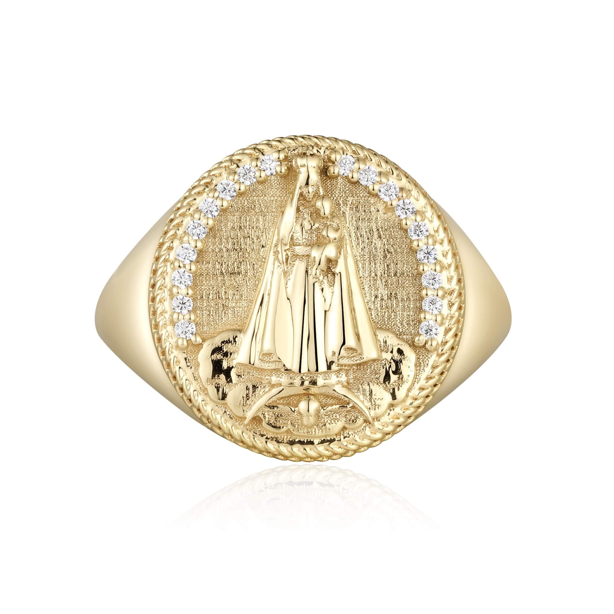 Grace. Protection. Eternal Faith. The Our Lady Signet Ring is a deeply meaningful piece of religious jewelry featuring a beautifully detailed relief of Our Lady of Fatima — robed, crowned, and standing upon a cloud pedestal — set against a brushed, textured background. The oval face is framed by a twisted rope border with round brilliant-cut stones set in a crescent arc above the figure, adding a heavenly glow to the composition. The shank tapers cleanly from the face, offering a comfortable, wearable fit.